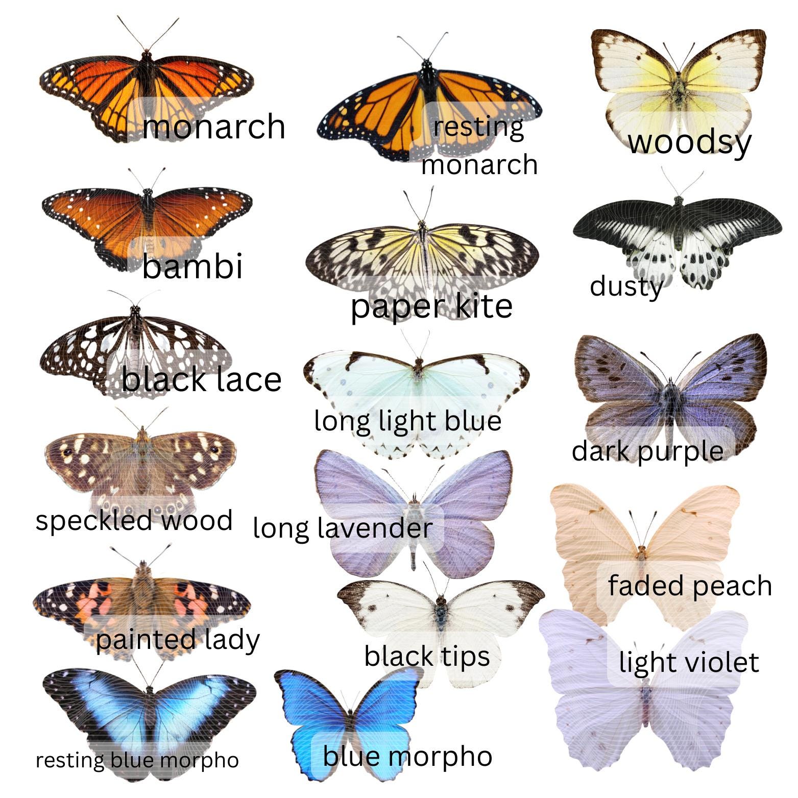 Some popular options are shown in 3rd photo, but almost any butterfly/moth in the shop can be made goliath size 15-17" wing span. Message me to get exactly what you want. You can use screen shots or simply describe the butterfly/moth and I will send photos to confirm.